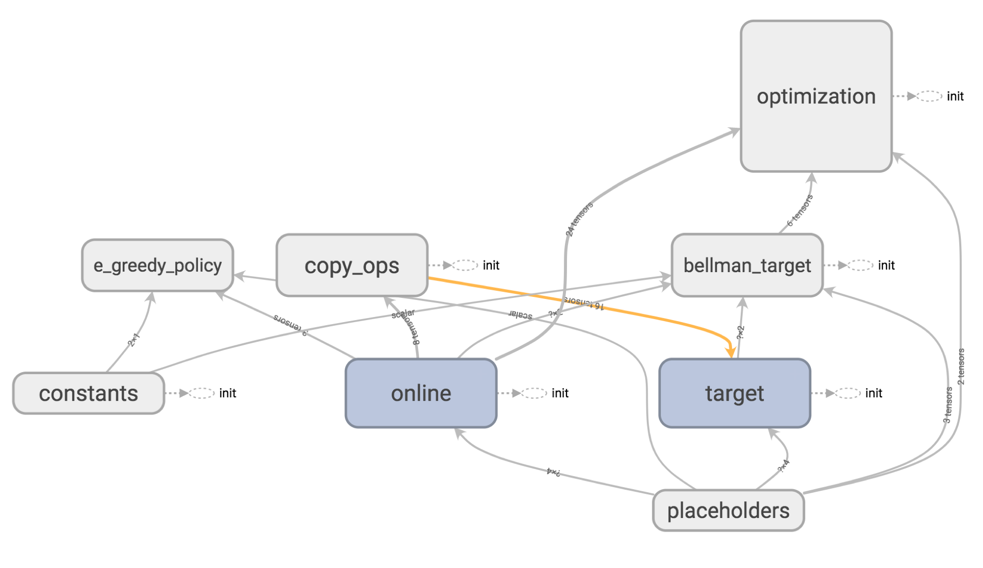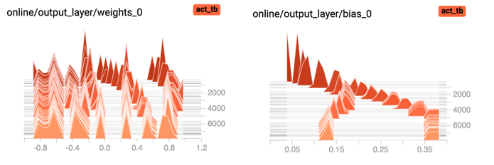 To do this I added the weights as histograms in Tensorboard by indexing a list of parameters for the online and target networks. This is hacky - Tensorflow didn’t like iterating over this list so I just indexed out the last layer weights and biases for both networks.