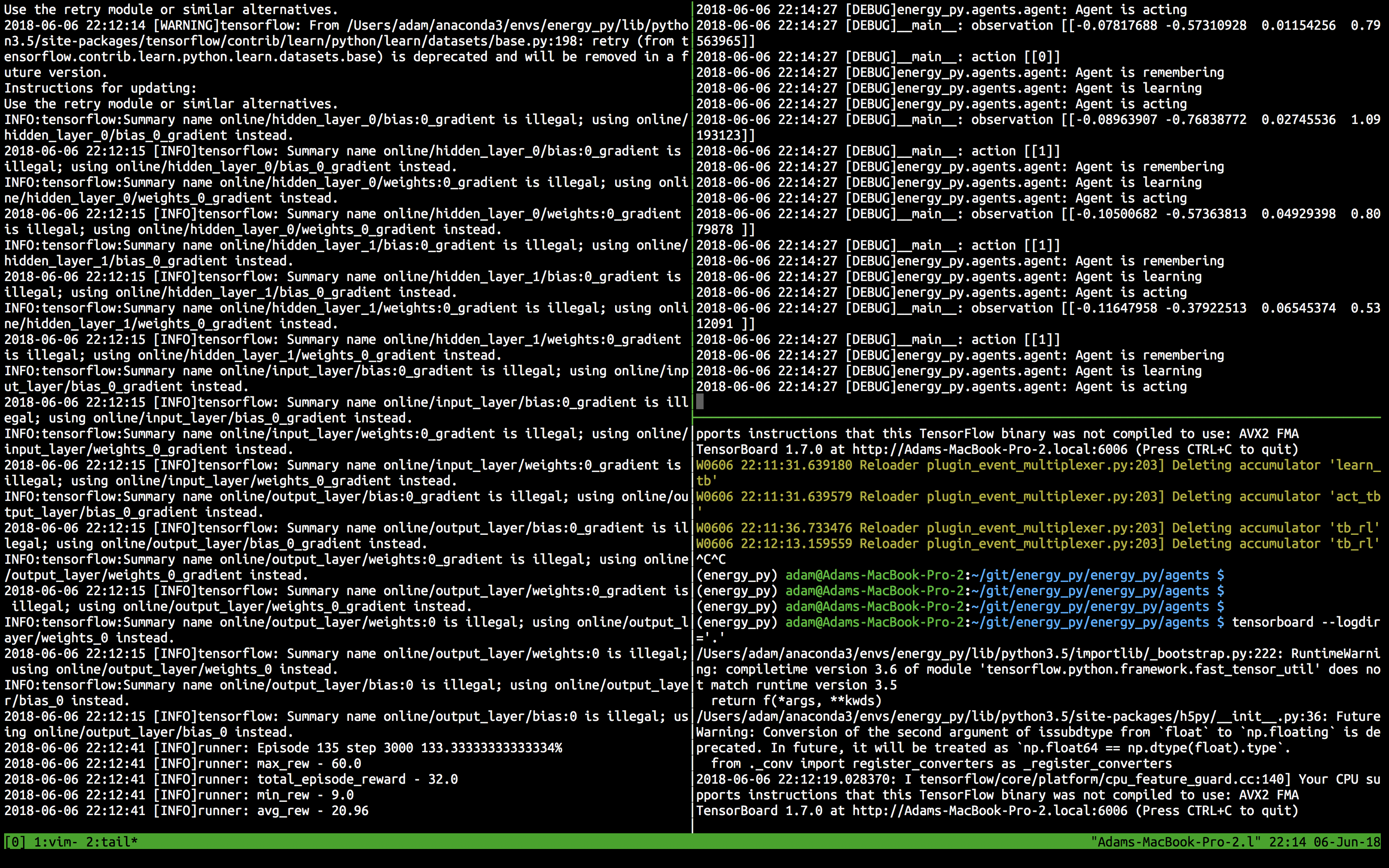agent.action() and agent.learn()While I think obsession over what tools (i.e. which editor to use) is unhelpful, I do think that anyone who takes their work seriously should take pride in the toolset they use. For this experiment I used a combination of tmux, vim, an info & debug log and Tensorboard to try get an understanding of what’s going on.
