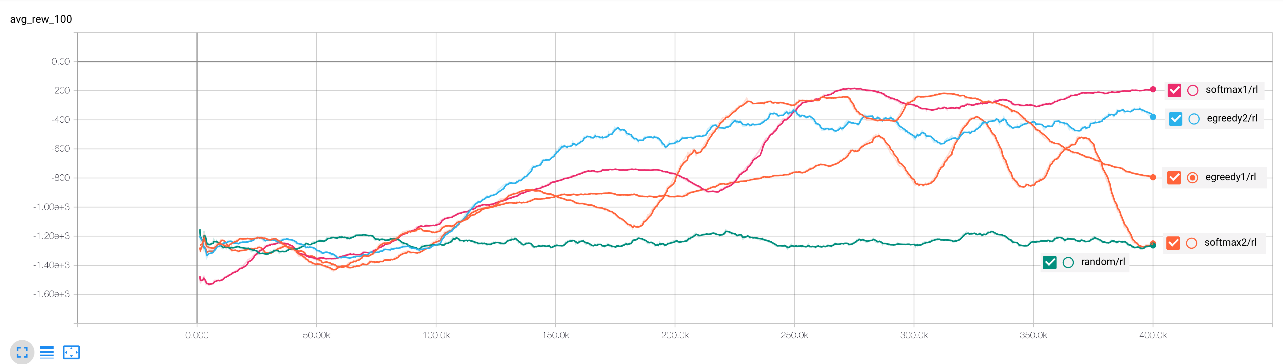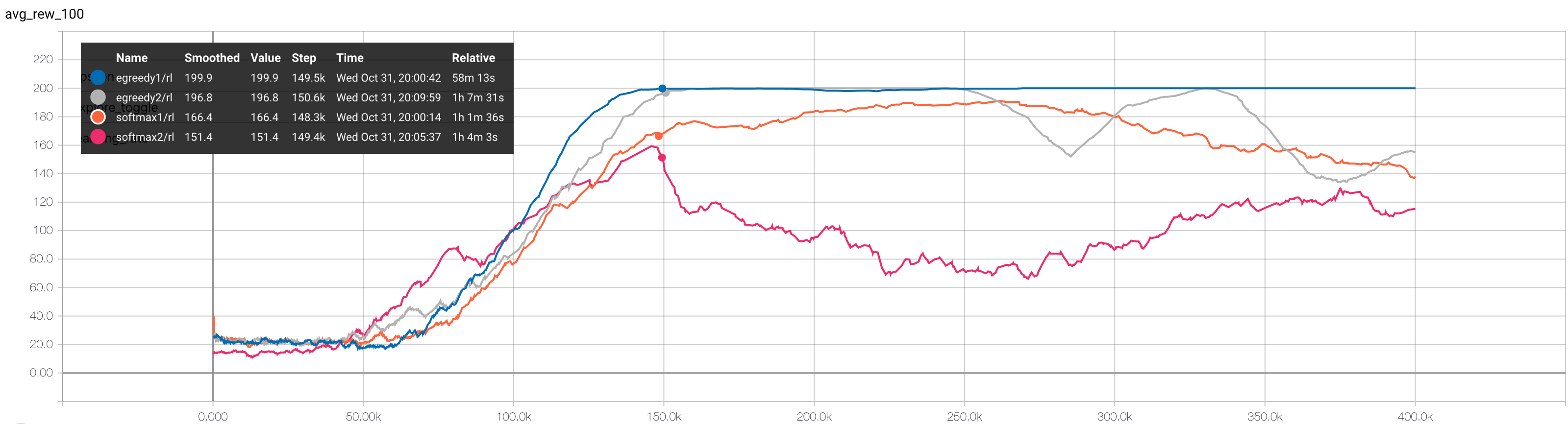 I ran four runs - two with an epsilon-greedy policy and two with a softmax policy. The experiments were run on the master branch of energypy at this commit.