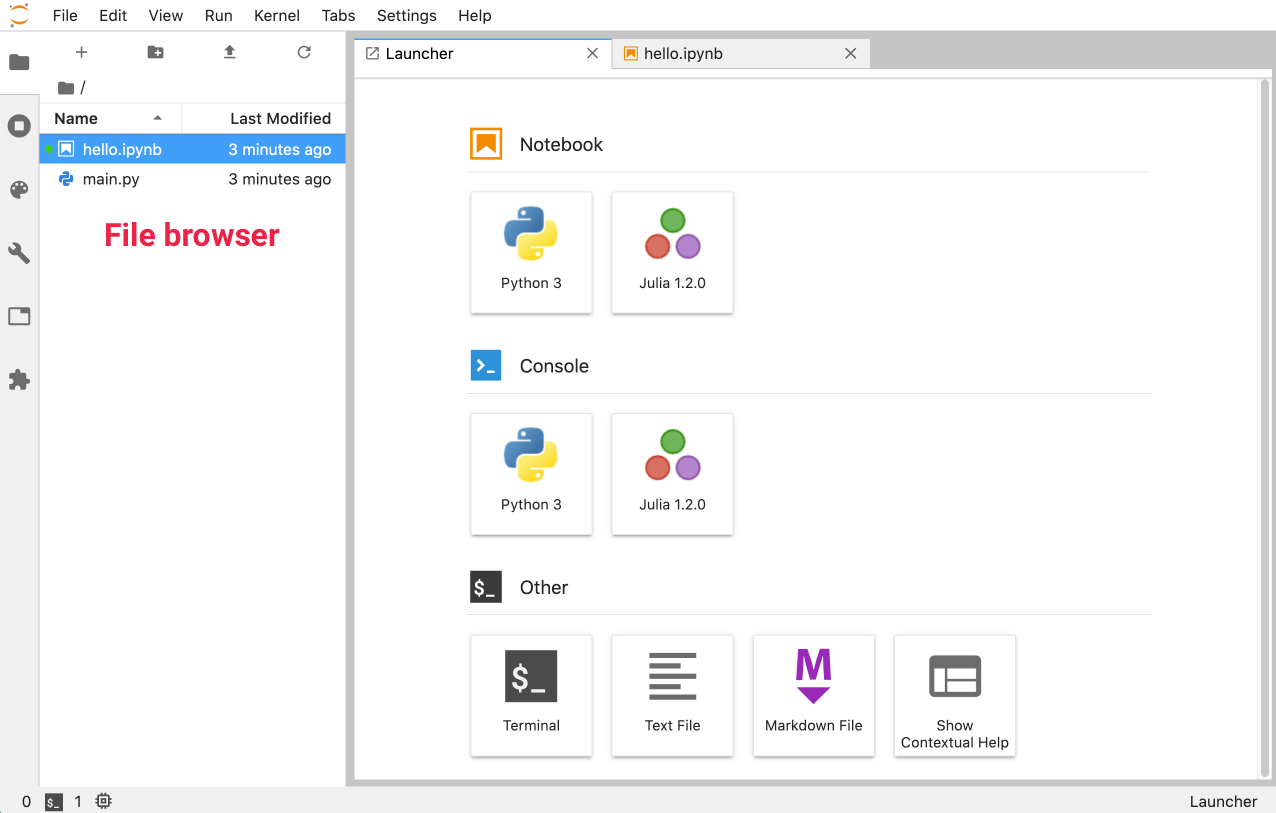 $ jupyter labYou can then point your browser to http://localhost:8888/lab, and you’ll see the Launcher screen, shown below with the File Browser open in the sidebar: