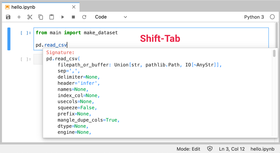 Pressing Shift-Tab will show a tooltip for the function or class your cursor is on: