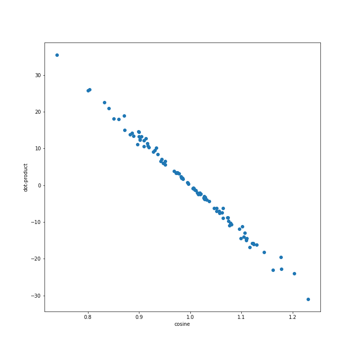 The dot-product acts like a similarity between the keys & values - below is a small program that plots both the dot-product and the cosine similarity for random data: